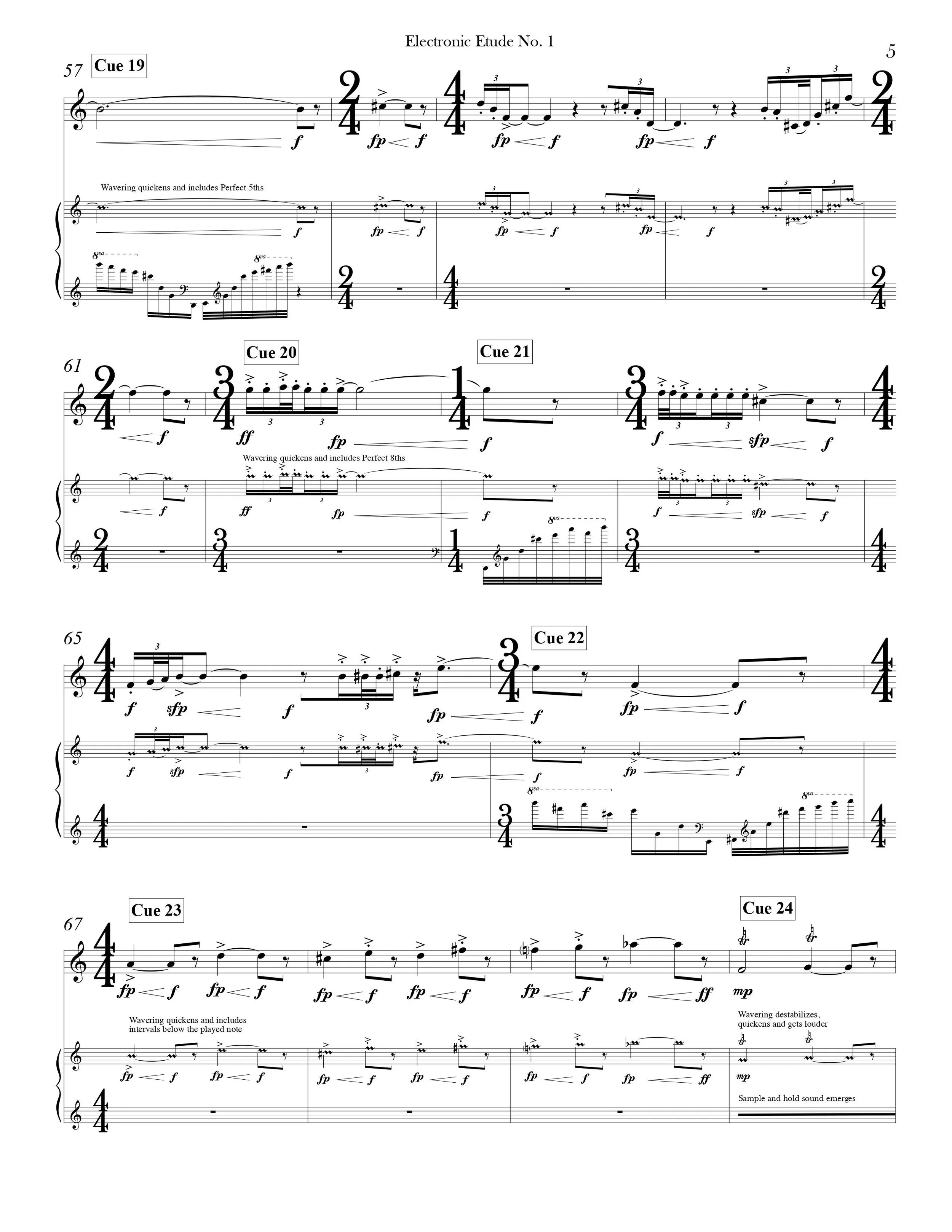 Electronic Etude No. 1 synthesizes sine tones and processes the sounds of a trumpet during a live performance. The processed sounds include the harmonization of the trumpet. This harmonization takes the trumpet’s sound and bends it to create harmonies of 2nds, 3rds, 5ths and octaves above and below the sounding trumpet pitches. The harmonization appears in a number of ways ranging from simple imitation to high-speed, randomized counterpoint. The sine tones create an atmosphere of reflection, while the live trumpet and harmonizations steadily increase in tension to a climactic moment that ends suddenly with a low sine tone. This tone creates a wall that the frantic trumpet and harmonizations run into, stopping the frenzied momentum in its tracks. The closing material is somber in nature with a gloomy reflective sine tone progression ending the work.